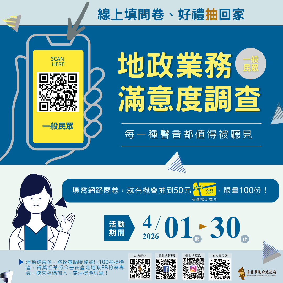 臺北市地政局持續精進「臺北地政雲」、「臺北地政找房+」等各項服務及機關網站,近年來更陸續推出「都更/地政資訊平台」、「臺北地政總管+」及防詐三寶(地籍異動即時通、住址隱匿、指定送達處所)多合一申請等創新優質措施。為了解市民朋友對於本市提供各項地政服務措施滿意情形,自即日起至115年4月30日舉辦滿意度調查,竭誠歡迎掃描QR Code或至本局網站填寫線上問卷,或至本市各地政事務所隊洽公櫃檯填寫紙本問卷,給予本局寶貴建議。
