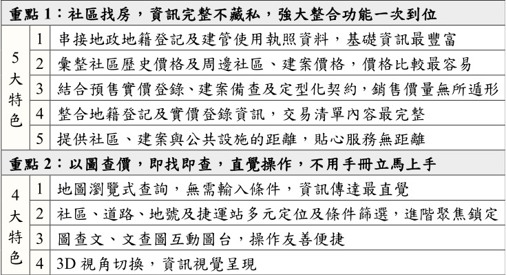 在資訊爆炸時代,社區交易各項相關資訊散落於不同網站中,民眾不僅彙整費時,也不易解讀。北市府地政局從使用者角度出發,網羅成屋社區及預售屋建案,整合地政地籍登記及建管使用執照資料,一次打包基本資料、實價登錄及周邊公共設施資訊,提供社區近一年及歷史均價、最高、最低價及周邊社區環域均價,方便民眾從單一網站取得複合式社區交易資訊,輕鬆解讀區域房價行情。