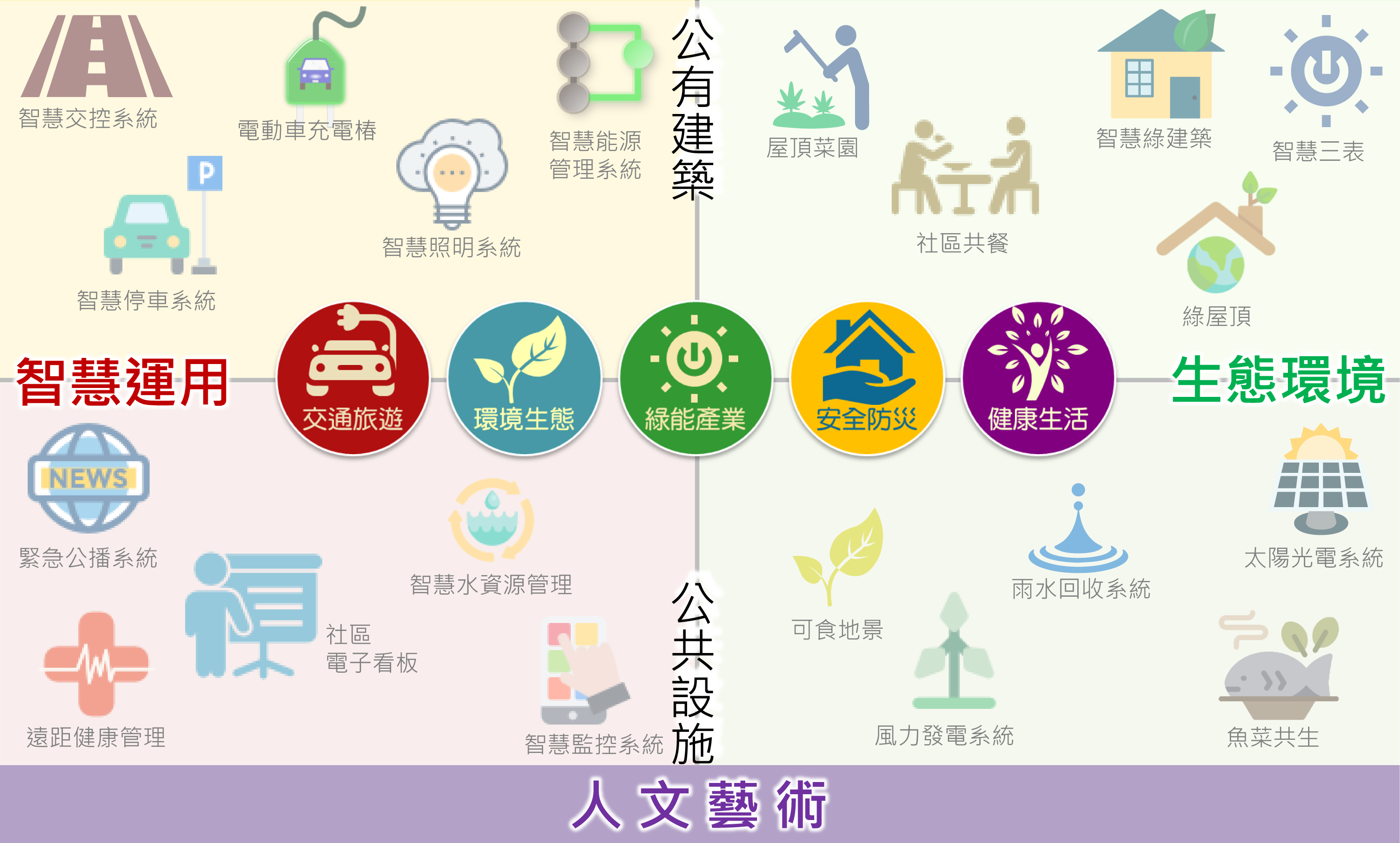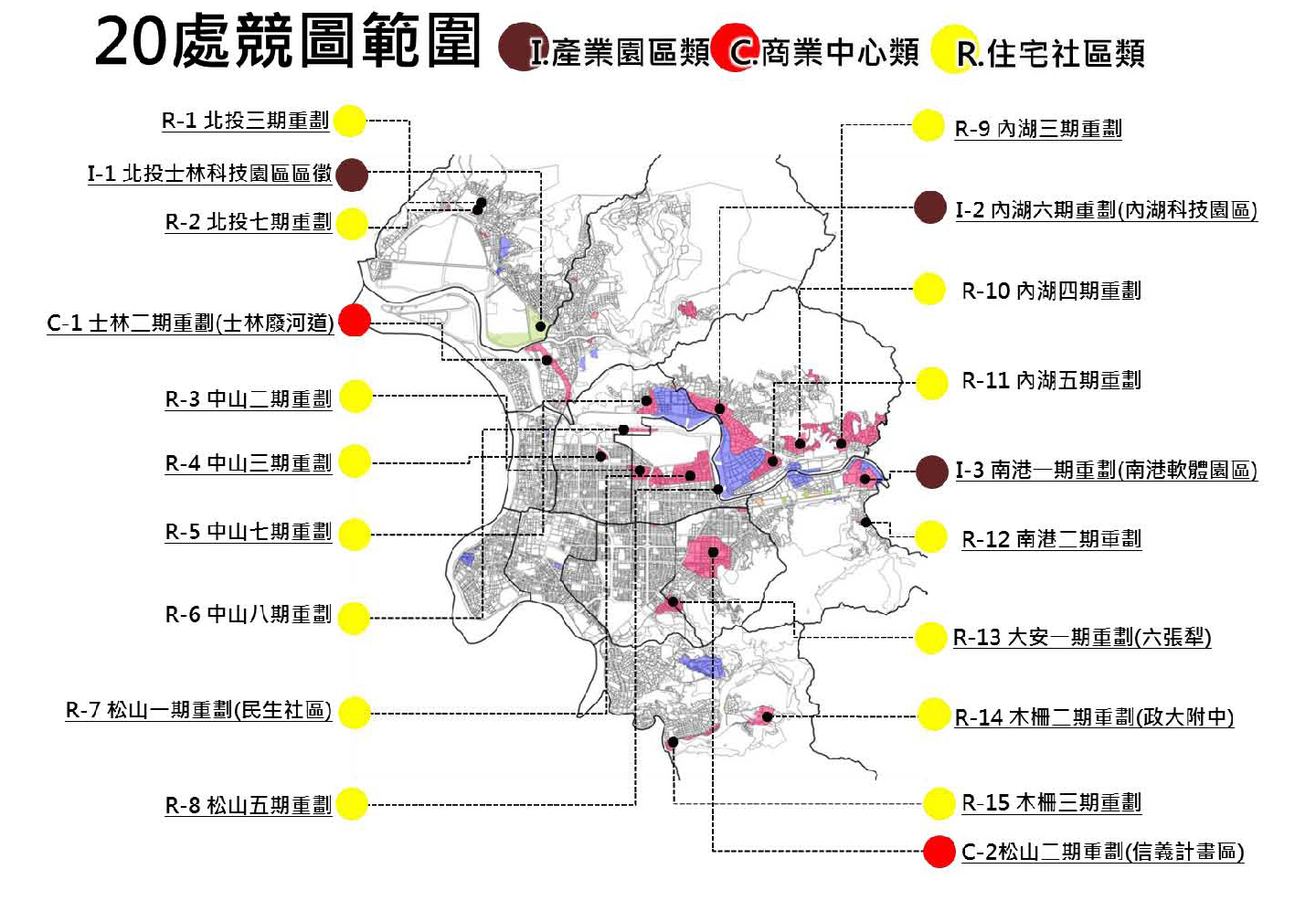 為了擴大全民參與,地政局自106年6月7日至8月16日舉辦「2017第一屆臺北智慧生態社區設計競圖」,競圖主題以交通旅遊、環境生態、綠能產業、安全防災及健康生活為5大構面,納入智慧運用、生態環境及人文藝術的設計元素(圖1),徵求各界就精選出之產業園區、商業中心、住宅社區等3類共20處競圖範圍(圖2),擇定規劃設計基地提出解決當地問題、提升生活品質的可行設計方案。