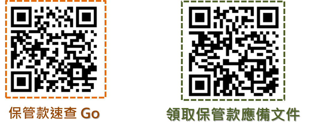 如果您或是您的長輩有土地被徵收,可以掃描保管款速查GO QRcode進入「徵收補償費保管款速查GO」網頁,只要輸入應受補償人姓名或統一編號及驗證碼,即可查詢是否有保管款未領取;如要申請領取保管款,請掃描領取保管款應備文件QRcode即有詳細說明相關應備文件,並可下載相關申請書表。