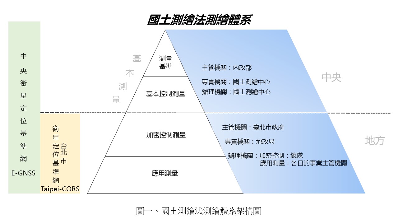 依據國土測繪法相關規定,測量基準與基本控制測量由中央主管機關辦理為原則,直轄市、縣(市)主管機關掌理轄區內加密控制測量業務之規劃、實施及管理、應用測量之規劃、實施及管理,並規範應將測量成果建立資料庫,公開資料清冊供各界查詢。而各級主管機關應指定專責機關或單位,統籌協調所轄有關測繪業務。(圖一)
