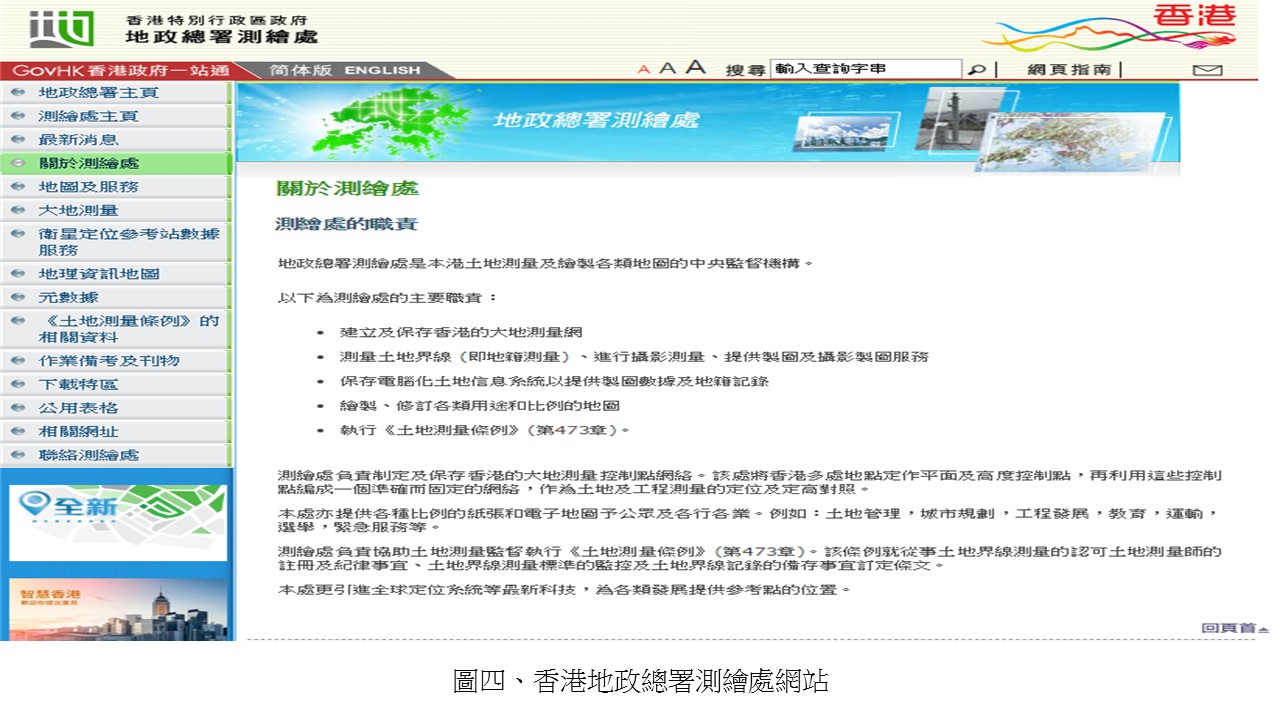 建立良善的測繪制度,結合ICT應用導入智慧化管理,讓所有規定明文化、制度化,正是我們地政局全力以赴實現的目標。未來在制度面上,將持續配合社會脈絡積極檢討及修訂各項國土測繪及地籍測量相關法令,以建構合理化的測繪制度。在組織面上,可參考香港政府地政總署測繪處(圖四)之作法,研議規劃成立本市之測繪業務專責機構,以收事權統一之效。在人力資源面上,持續派員參加各項教育訓練,並參與國內外各項測繪相關論壇與研討會,透過學習新知引進新技術以達成智慧測繪的發展目標。
