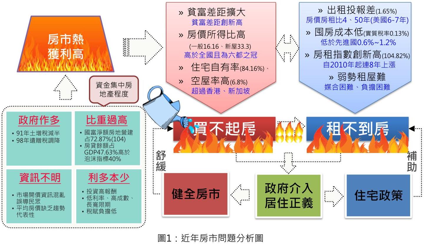 高房價民怨之首,北市房價所得比在102年第4季達到15.01,全球最高,104年第1季更創新高達16.16!過去政府帶頭作多,炒房拼經濟;房市資訊不明,易哄抬;房地價稅不合理,投資利多本少以及國人有土斯有財觀念,導致房地資產配置比重過高,造成房市過熱、房價高漲,民眾買不起房,甚或租不到房的「居住不正義」成為眾矢之的(圖1)。