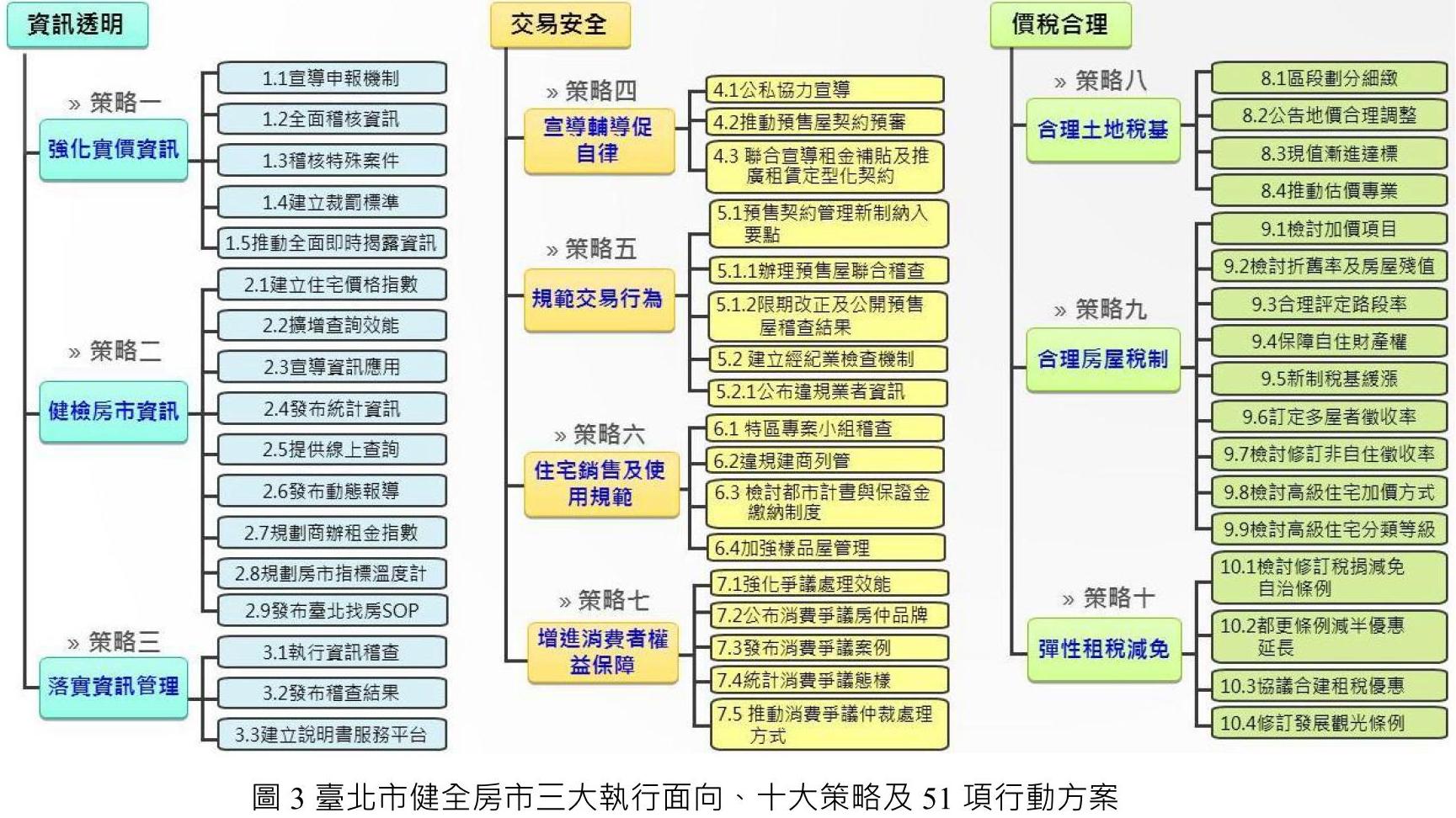 為落實居住正義,解決房市亂象四大結構性問題,健全房市政策以「資訊透明」、「交易安全」、「價稅合理」與「金融穩健」四大面向為基礎(圖2),其中除金融穩健政策有賴中央政府權責外,就其他三大面向整合相關政策行動,盤點提出十大策略及51項行動方案(圖3),期望透過方案的推動,引導房地產市場健全發展,逐步邁向宜居永續的居住正義,以下將從「資訊透明」、「交易安全」、「價稅合理」三大面向分述106年重要執行方案及成效。