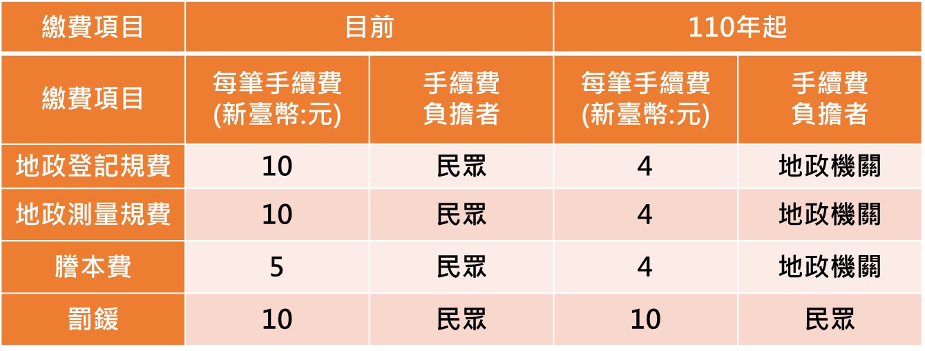為配合本府推廣電子支付,110年起,民眾到本市各地政事務所洽公使用該Pay.Taipei平臺繳納地政規費需負擔之手續費由新臺幣(下同)5至10元,調降為0元(如下表1);另繳納「罰鍰」之手續費維持10元,仍由受裁罰人自行負擔。
