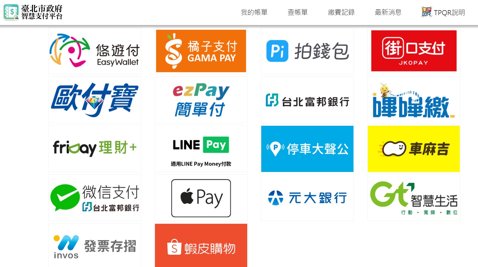 智慧支付平臺合作業者陸續增加中,目前已支援多家行動支付業者APP錢包工具,包含悠遊付、橘子支付、Pi拍錢包、街口支付、歐付寶、ezPay簡單付、台北富邦(網路銀行)、嗶嗶繳、遠傳friday錢包、LINE Pay Money、微信支付、Apple pay等,讓您自由選擇付款方式,享受多元便利繳費服務並帶動無現金社會發展。