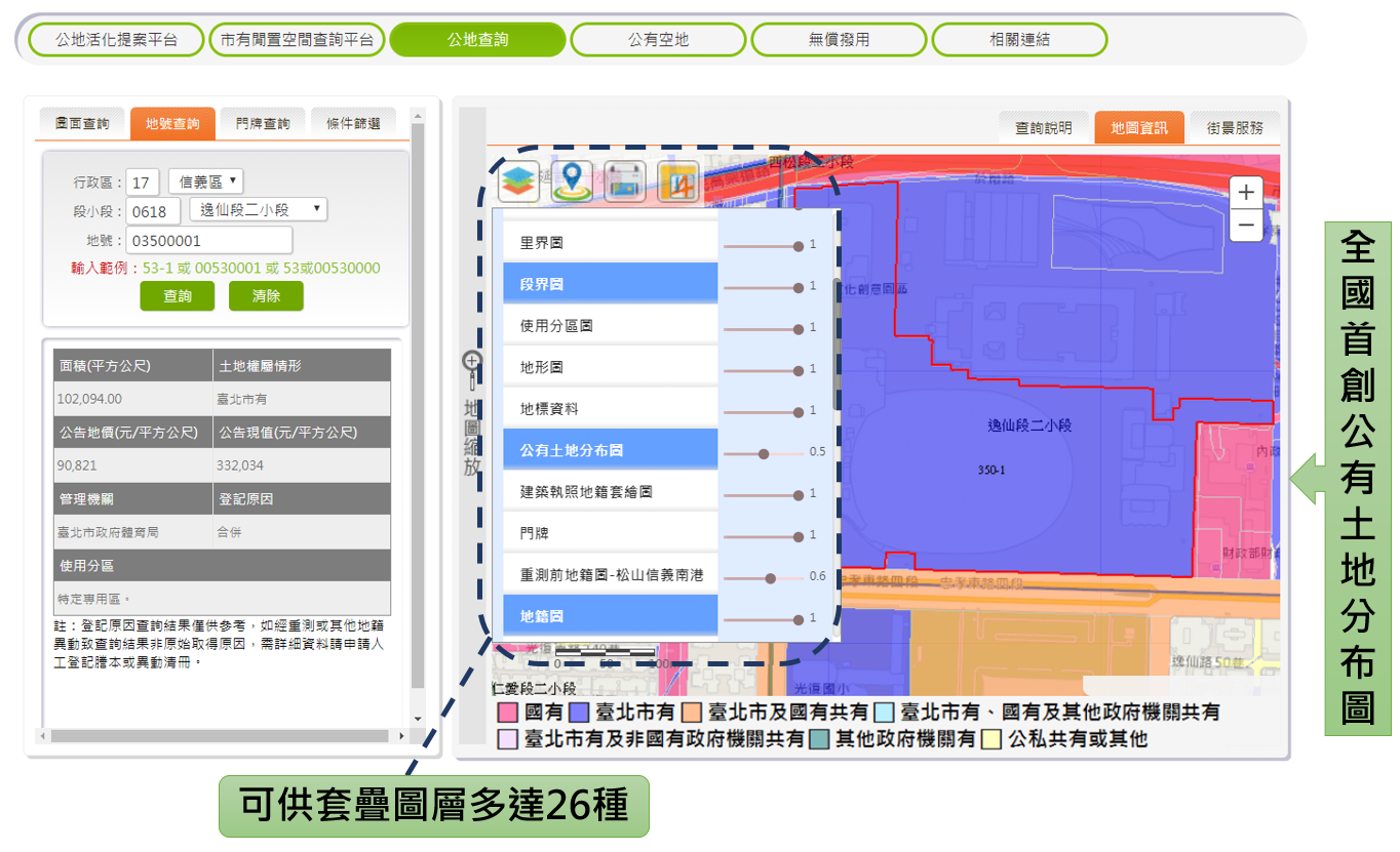 進入公地查詢頁面後,系統預設顯示全國首創之公有土地分布圖,將於地圖上依公有土地權屬情形顯示顏色,例如國有、臺北市有、公私共有等多種權屬情形,使公地位置及分布情形一目了然。地圖資訊則有臺北市電子地圖、都發局航測影像2種底圖,並提供使用分區圖、地籍圖、門牌、地形圖等17種通用圖層,5種週邊環境顯示,4種地政業者定位,共計26種圖層供使用者套疊運用。(圖二)