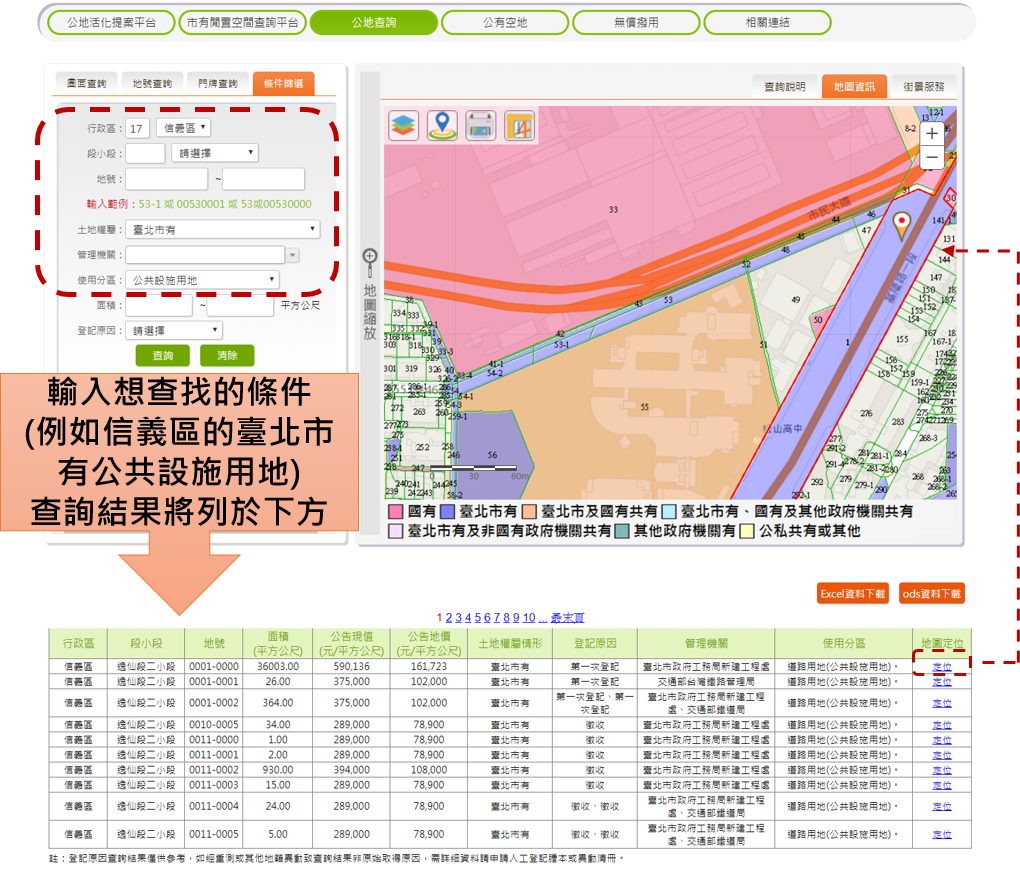 使用者選擇特定條件需求後,查詢結果清單將表列於頁面下方,除選取查詢欄位資訊外,亦將顯示公有土地基本資料,並提供EXCEL及ODS檔案下載功能,方便使用者產製土地清冊。若需了解各筆公有土地確切位置,只要點選查詢結果地圖定位,即能跳轉至圖面點位,輕鬆對照地理位置。