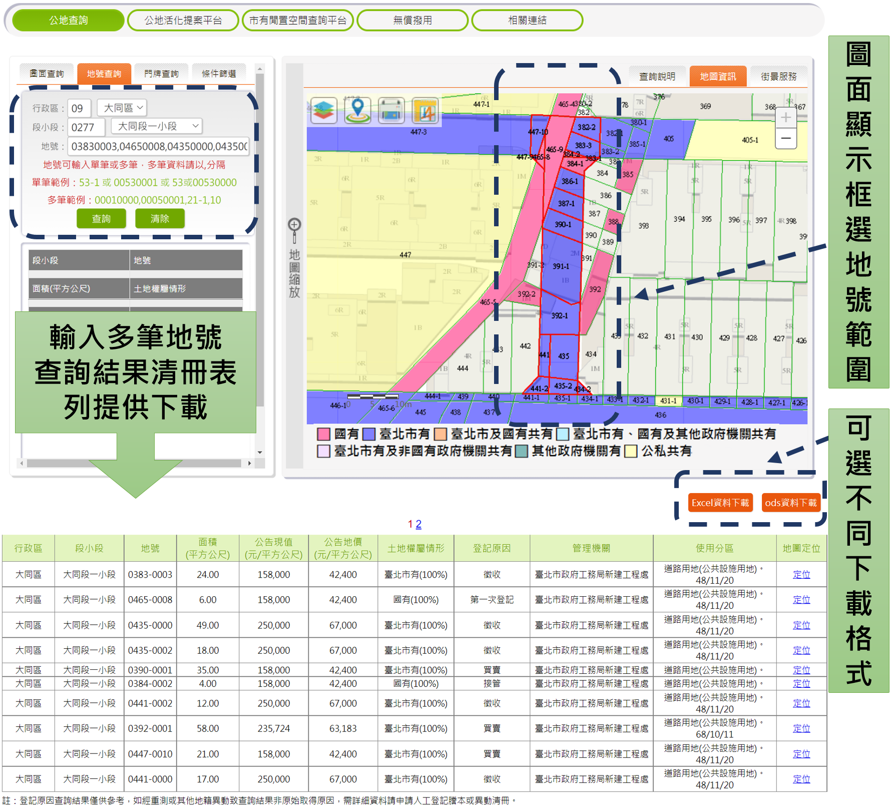 今(110)年度於查詢介面中新增多筆查詢功能,使用者可一次輸入多筆土地地號搜尋,查詢結果將清單表列並提供EXCEL及ODS兩種檔案格式供使用者需要下載;同時為方便使用者對照確認四至位置,亦自動於圖面顯示框選地號範圍,減少查詢與造冊之時間成本(圖一)。