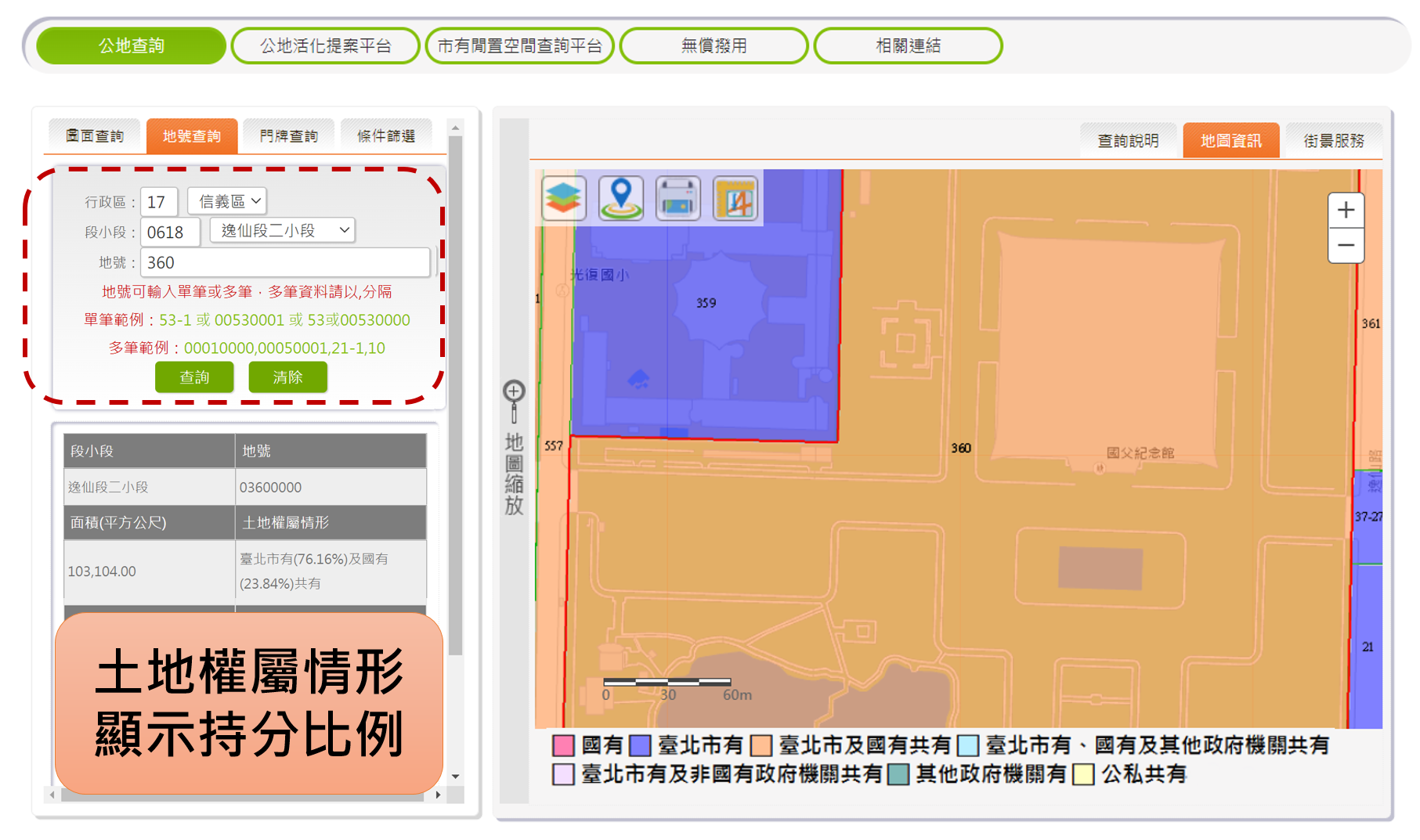 「公地查詢」過去已有面積、土地權屬、管理機關等土地資訊欄位,惟土地權屬僅顯示所有權人單位,並未揭露各土地所有權人持分比例;現為促進資訊公開,土地權屬情形欄位將依所有權人持分計算概略百分比,增加各筆土地權屬比例資料。無論是國有、臺北市有、其他政府機關有,各種比例一目瞭然。本功能上線前,如需得知土地產權情形,需申請謄本調閱地籍資料並自行計算;現在用地機關可迅速了解土地產權情形,增加土地使用及公地管理之效率,民眾亦可輕鬆得知土地權屬情形,大大減少資訊取得、判讀及計算之時間成本(圖二),公私部門頗受好評!!