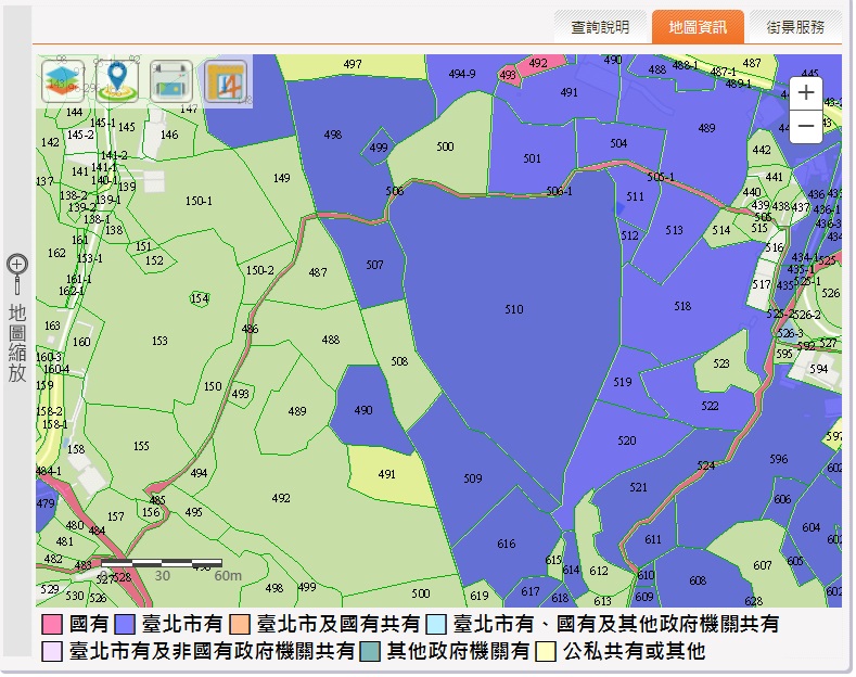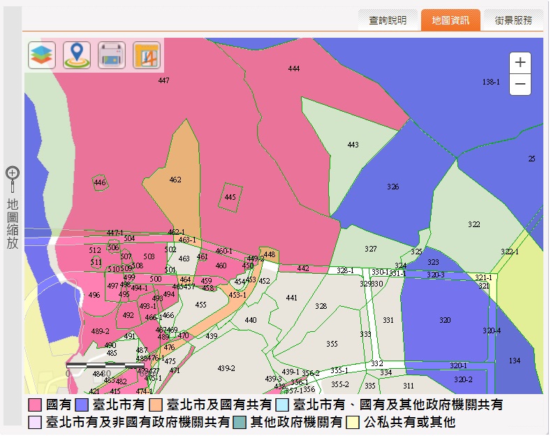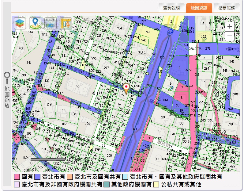 公文主旨通常都是一整條路名或一個街廓(圖一),至少三十個地號,電線桿通常會選擇放置在公有土地上,承辦人員現場使用臺北地政雲公地查詢功能,哪邊有公有土地一目了然(圖二),不需要逐一地號搜尋。