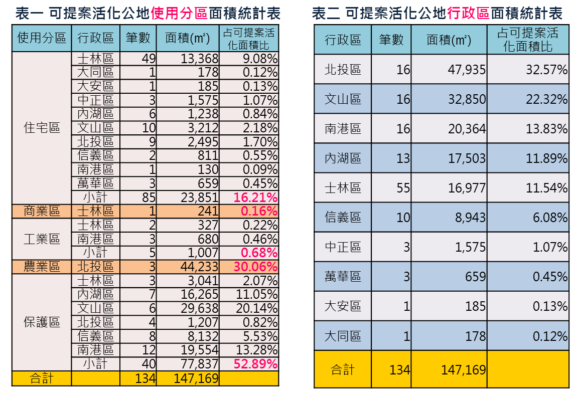 可供民眾提案活化之15公頃公地,分別由教育部、臺灣高等法院、經濟部水利署第十河川局、新北市政府財政局和澎湖縣望安鄉公所等5個機關提供,並分布於松山區與中山區外之10個行政區,經以各使用分區類別統計分析(表一),其中保護區、農業區和住宅區為主,如以各行政區面積統計(表二),則多數位於北投區、文山區及南港區。