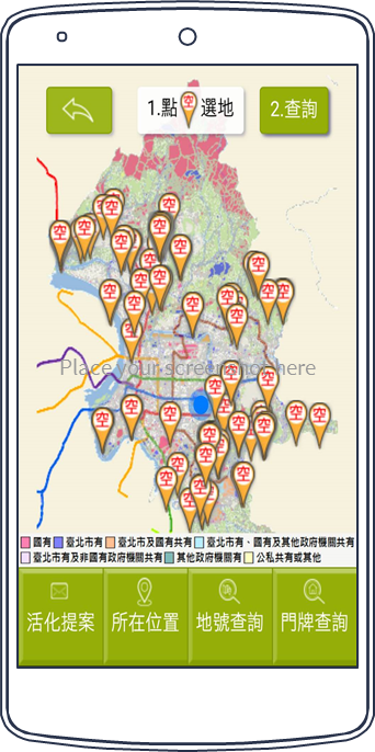 臺北地政雲「非市有公地活化提案平台」可運用桌上電腦網頁(圖1)或智慧型行動裝置(圖2),選取想要提案的公有空地撰寫活化計畫,系統將轉送活化計畫給管理機關,作為公地活化參考。相關操作說明詳見<臺北地政雲公地活化提案新功能全攻略>。