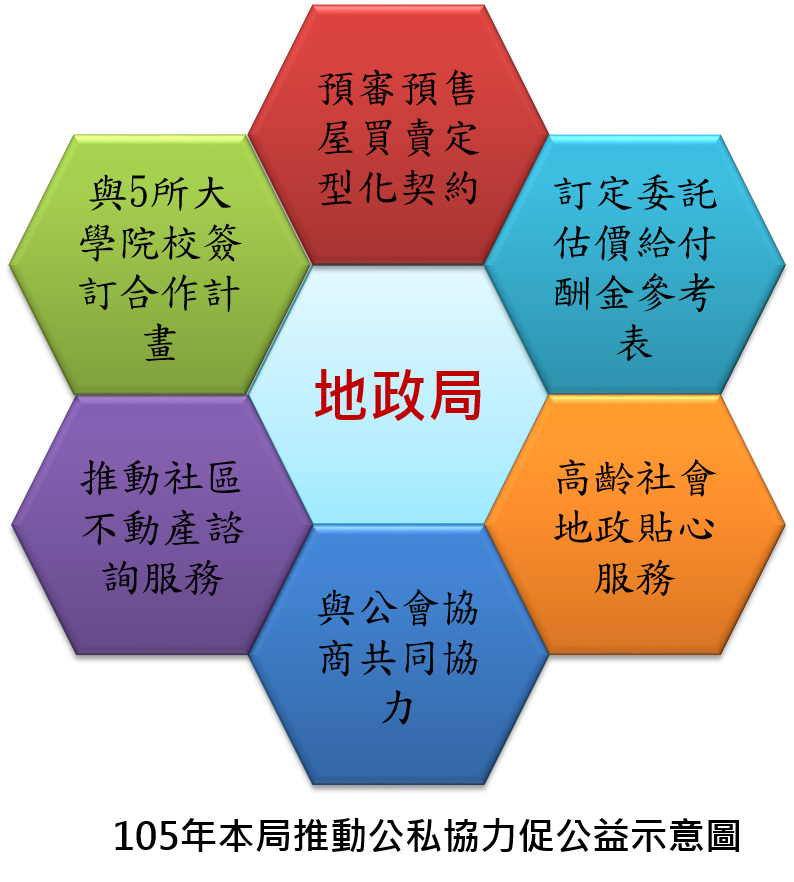 105年是本局與各界大合作的一年!為創造出更符合民眾期待的施政品質,本局結合公(中央、地方機關)、私部門(企業、公會),以「地政有感心服務」、「交易秩序繫互動」及「創新建置地政雲」及「協同資源」4大策略,共同推動「公私協力促公益」,期透過公私協力合作,提供民眾跨界、跨域服務,提升政府服務品質。