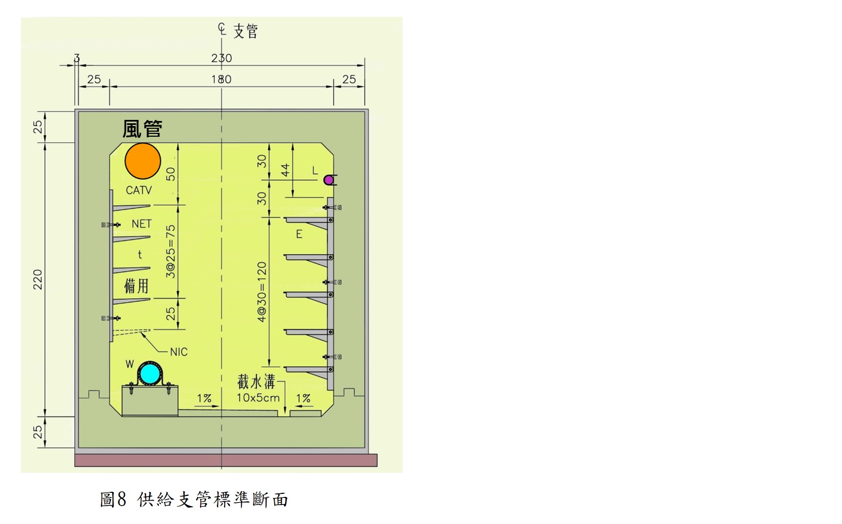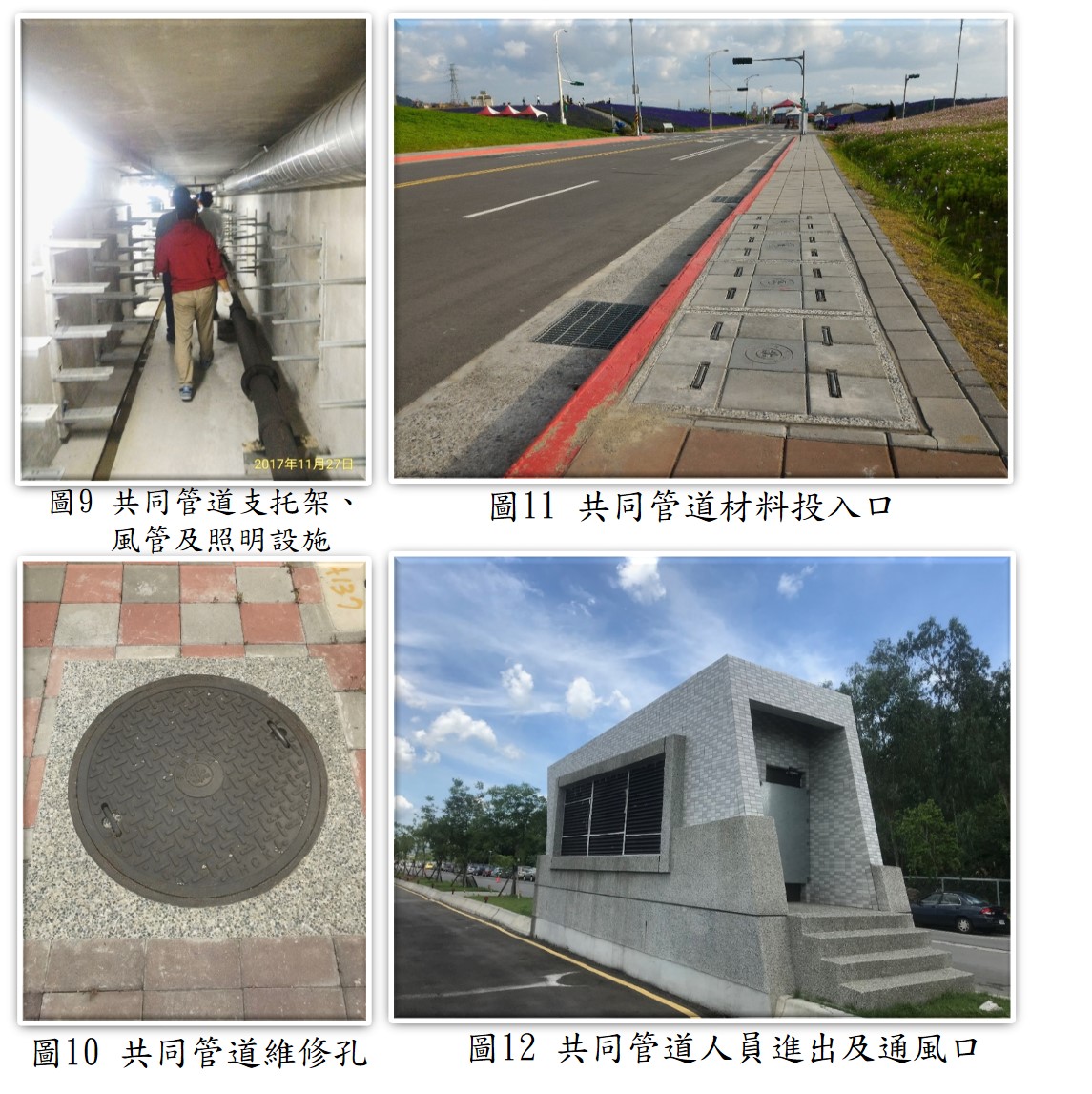 共同管道預留設所需電力、電信、自來水等維生管線及交通號誌、路燈等管路空間(如圖8),並在各街廓適當位置留設管道分歧部,供未來各基地申請建築開發時接續使用,以避免未來重覆挖補道路,取代傳統管線各自挖埋工法,並設立人員進出及通風口及材料投入口,方便後續管線維護及更新汰換施工。北投士林科技園區區段徵收區共同管道系統之設施包括福國路延伸段幹管、區內供給支管、維修孔、材料投入口、人員進出及通風口(如圖9至圖12),設施功能完備,有助提昇道路服務品質,打造宜居的臺北新區。