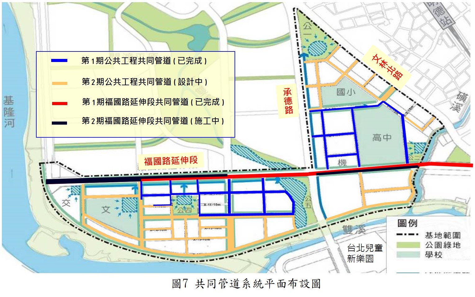 北投士林科技園區區段徵收區整體開發範圍內依不同道路系統層級設計共同管道系統,東西向主要道路(福國路延伸段)以布設共同管道之幹管、支管(供給管)為主,其餘區內次要道路或社區出入道路僅布設供給管。又北投士林科技園區區段徵收採先建後遷,以二階段開發方式辦理,主要道路已完工啟用之共同管道幹管長約875公尺、支管1,230公尺;次要道路或社區出入道路已完工啟用之供給管長約5,577公尺 (圖7),未來於第二期開發完成後,將再於福國路延伸段布設共同管道幹管1,218公尺、供給管945公尺及次要道路或社區出入道路布設供給管10,274公尺,相互串接,形成完整北科共同管道路網之基礎建設。