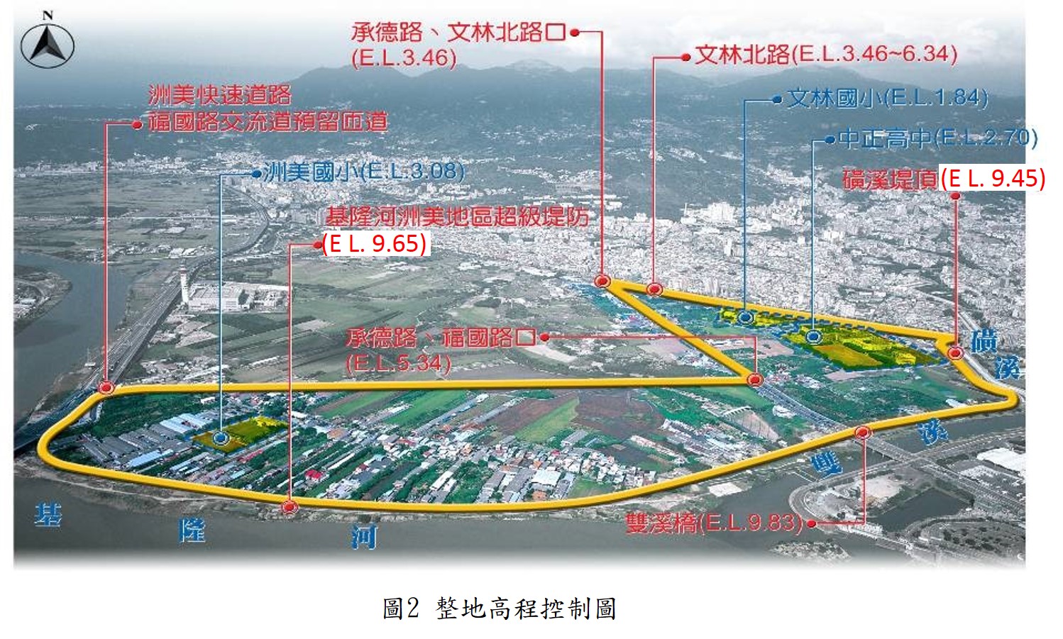 北投士林科技園區區段徵收範圍以承德路區分東、西基地,西基地位處基隆河與雙溪匯流口西北側,地勢低窪,易遭洪水氾濫侵襲,如何保障區內居民生命財產安全當為第一要務。本計畫區以大臺北地區防洪工程計畫200年洪水重現期防洪標準規劃堤防高程(EL9.65M),並以超級堤防型式布設,致外水不易入侵,加上超級堤防堤體寬廣可提高堤防強度,不致發生潰堤之情形;另本計畫區東基地位處臨磺溪與雙溪東匯流口西北側,因原有堤防高程EL9.45M,亦已達200年防洪標準,僅需配合北科超級堤防之填土整地方案(圖2至圖3),將堤防用地填築至EL9.45M,再配合整地修坡。整體景觀生態 親水休閒機能
