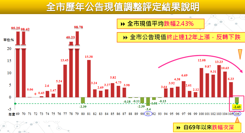 106年公告土地現值作業期間(104年9月2日至105年9月1日),受到整體經濟景氣不佳、房地合一課稅制度上路及不動產稅制改革議題等因素影響,不動產市場觀望氣氛濃厚,投資性買盤退散,全市買賣登記案件量共計24,572件,與去年同期相較減少2,222件,減少幅度約8.29%。調查全市12行政區地價均呈下跌情況,經本市地價及標準地價評議委員會評定全市106年公告土地現值平均調幅為-2.43%,終止民國94年以來連續12年上漲之走勢,平均調幅亦為民國69年有統計數據以來第二大跌幅,亦為已公布評定結果之直轄市中跌幅最深。