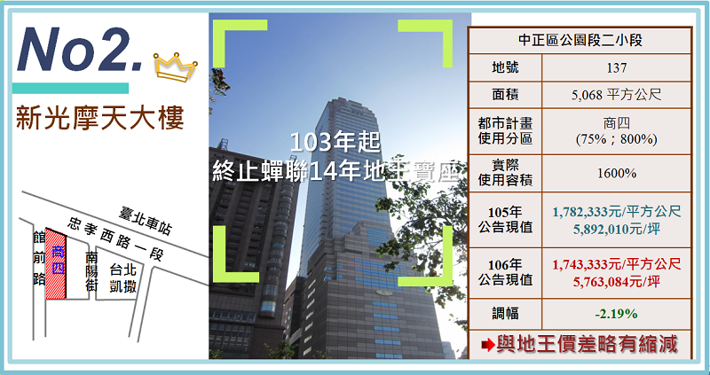 穩居地后寶座的新光摩天大樓106年公告土地現值為每平方公尺1,743,333元(每坪5,763,084元),與105年公告土地現值每平方公尺1,782,333元(每坪5,892,010元)相較下趺2.19%,與地王價差略有縮減。由於站前商圈受惠於西區門戶計畫整體規劃影響及機場捷運線即將通車等發展利基,未來新光摩天大樓能否重返昔日地王榮耀,仍視後續發展而定。