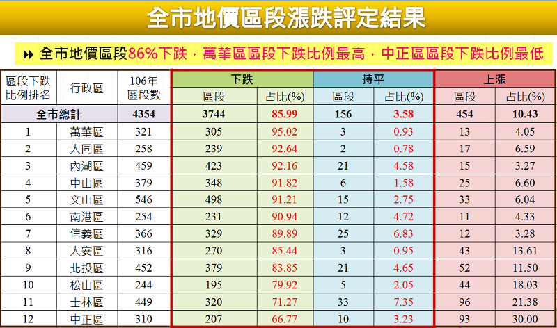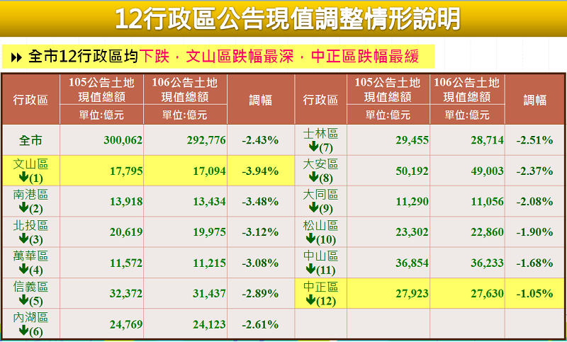 各行政區中以文山區跌幅-3.94%最深,此外中正區買賣移轉交易量較去年同期增加2.67%,交易動能相對穩定,加以市府持續投入西區門戶計畫及捷運萬大線動工興建等因素支撐下,調幅-1.05%最小,中山區調幅-1.68%次之。不過,在整體房地產景氣不佳,全市地價普遍下跌情況下,仍有10.43%區段因整體開發及重大公共工程建設帶動,或土地使用變更,土地使用強度與效益提升,或因反映實價登錄動態,公告土地現值仍有上漲情形,其餘89.57%區段多為下跌或持平。