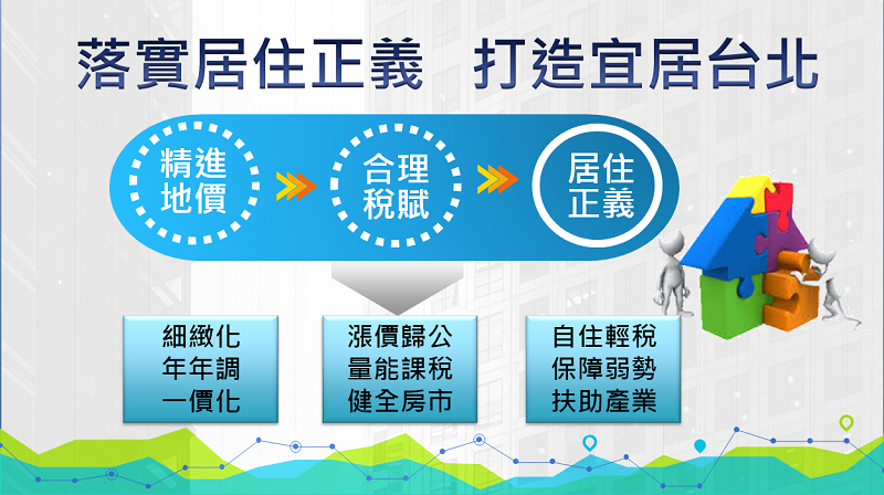 本府近年辦理地價作業持續以地價區段劃分細緻化、縮短公告地價調整頻率及地價單一化三項行動方案,朝向精進地價評定目標邁進。其一,地價區段劃分細致化,讓公告現值更能合理反映區域地價水準與動態差異,以105年為例,北市地價區段新增率4.27%,高於全國平均1.29%,為全國第一,106年持續新增地價區段,新增率為4.79%;其二,支持中央修法縮短公告地價調整頻率並以每年調整為目標,除可即時反應地價動態外,亦可避免累計調幅過大,減緩衝擊;其三,協同中央推動地價單一化,回歸估價專業,解決現行土地多價問題。後續將落實「臺北市健全房市行動綱領」,實踐漲價歸公,量能課稅,以健全房市發展,在本府居住正義政策架構下,達到自住輕稅、保障弱勢、扶植產業的目標。