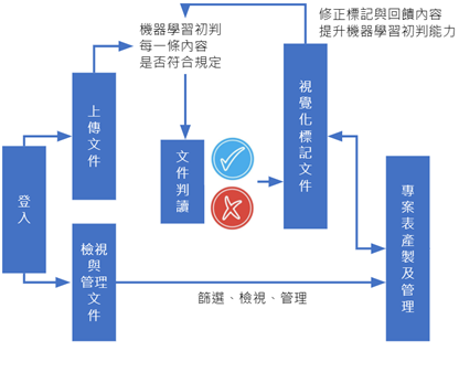 智慧政府以資料為骨幹,應用物聯網與區塊鏈串聯政府服務與民眾需求,結合人工智慧雲端運算,優化決策品質。北市地政局十分重視「資料」的力量,「臺北地政雲」及「臺北智慧地所」均結合既有公務端系統,讓資料流能由內而外,再由外而內。此外,於2021年針對資料流分別進行兩項人工智慧試辦案:「AI客服」與「AI契約審查」(圖2),透過建構機器學習,自動產生成果,以減輕人力工作,提高行政效率。