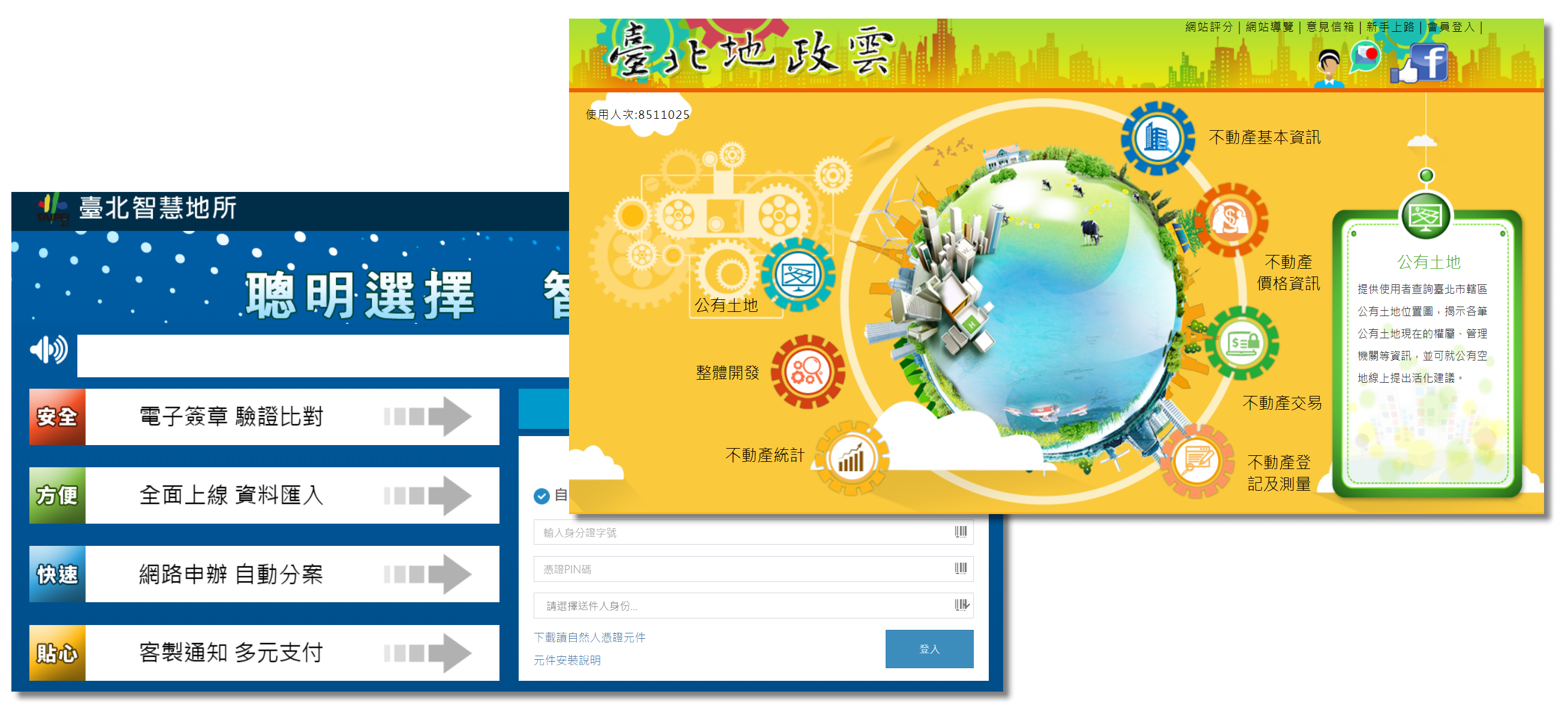 電子化政府以網際網路技術為基礎,提供業務電子化、程序網路化的政府服務。北市地政局以「臺北地政雲」及「臺北智慧地所」來實現電子化政府(圖1),前者是單一入口「查詢」平臺,結合屬性及空間資料提供地政資訊;後者是單一入口「申辦」平臺,讓臨櫃申辦案件轉為全程網路化。至2020年「臺北地政雲」每月有22.1萬民眾使用人次、20.2萬公務使用人次;「臺北智慧地所」(影片)開放所有登記、測量案件均可線上申辦,目前累積23,413件申辦量。