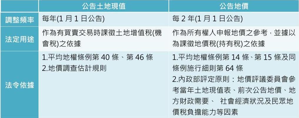 公告地價係併同公告土地現值作業辦理,由地價評議委員會依內政部函釋五大原則進行評定。就用途而言,公告地價為土地所有權人於重新規定地價時申報地價之參考,稅捐機關再據以課徵地價稅。另平均地權條例於106年5月10日修正,由每3年修改為每2年重新規定地價一次,目的在即時反映地價動態,落實稅賦公平,兩者比較如表1。