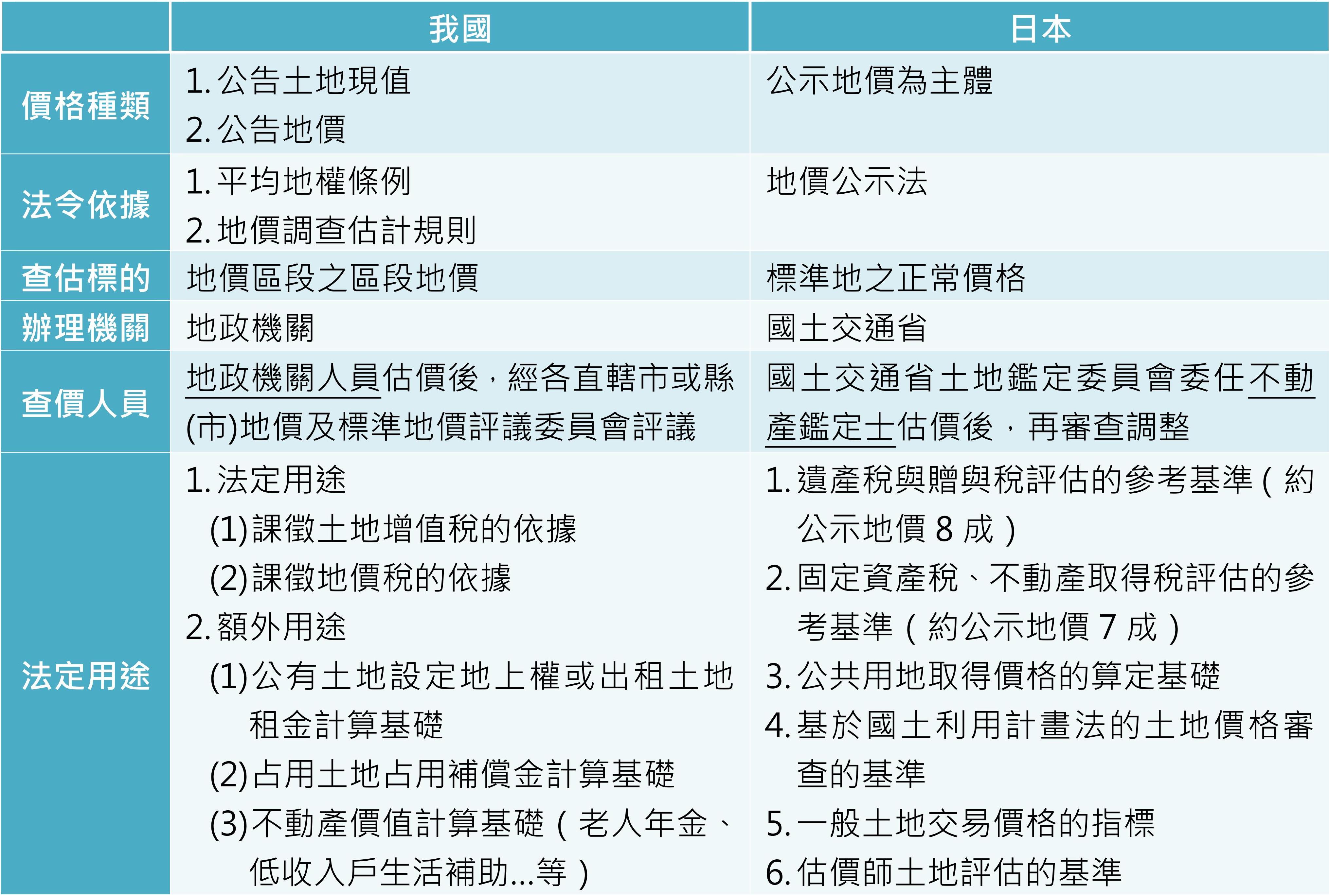 日本地價制度除國土交通省公示之標準地地價外,由都道府縣為土地交易管制之需要設立基準地,對公示地價進行補充修正,每個基準地要求1位以上的不動產鑑定士進行評估,評估結果經都道府縣知事審查後判定標準價格,以每年7月1日為價格日期,並於每年9月發布,所發布之基準地價與公示地價有相同評估標準。另國稅廳為課徵繼承稅、贈與稅計算土地價值需要,及市町村為課徵固定資產稅、都市計畫稅、不動產取得稅需要,分別委託不動產鑑定士參考公示價格評估宗地地價,作為課稅基礎。日本各類公部門查估地價如表2,又我國與日本公部門地價(以公示地價為例)經比較如表3。