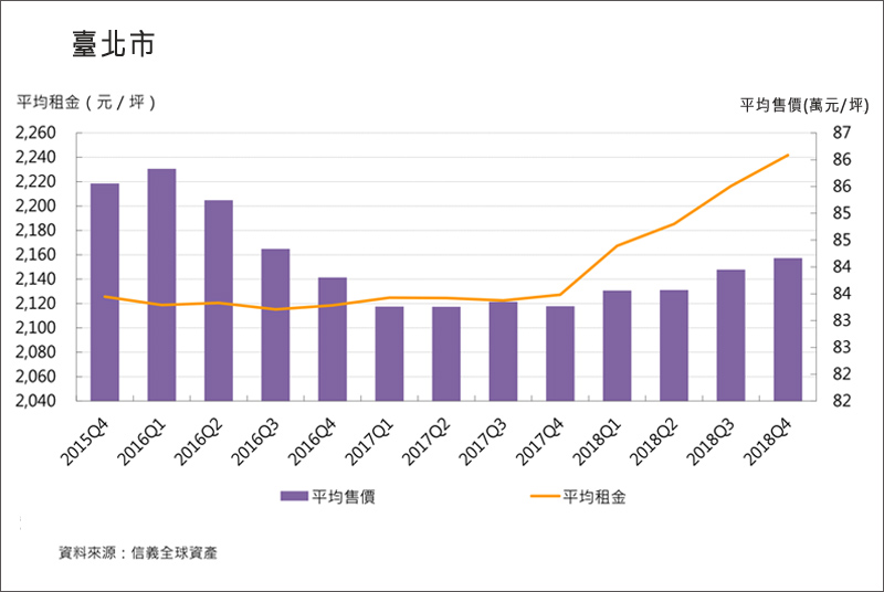 臺北市辦公室價格於2016年第1季達高峰,於2017年第2季最低,至2018年第4季逐漸回升。辦公室平均租金於2016年第3季為最低點,自2017年第4季起向上持續爬升。(圖3)