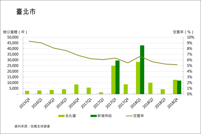 臺北市辦公室空置率從2015年第4季起下滑至2017年第4季,2018年第1季因新增大量辦公量體致空置率回升,至2018年第4季去化量大於新增供給量,空置率降至最低。(圖4)