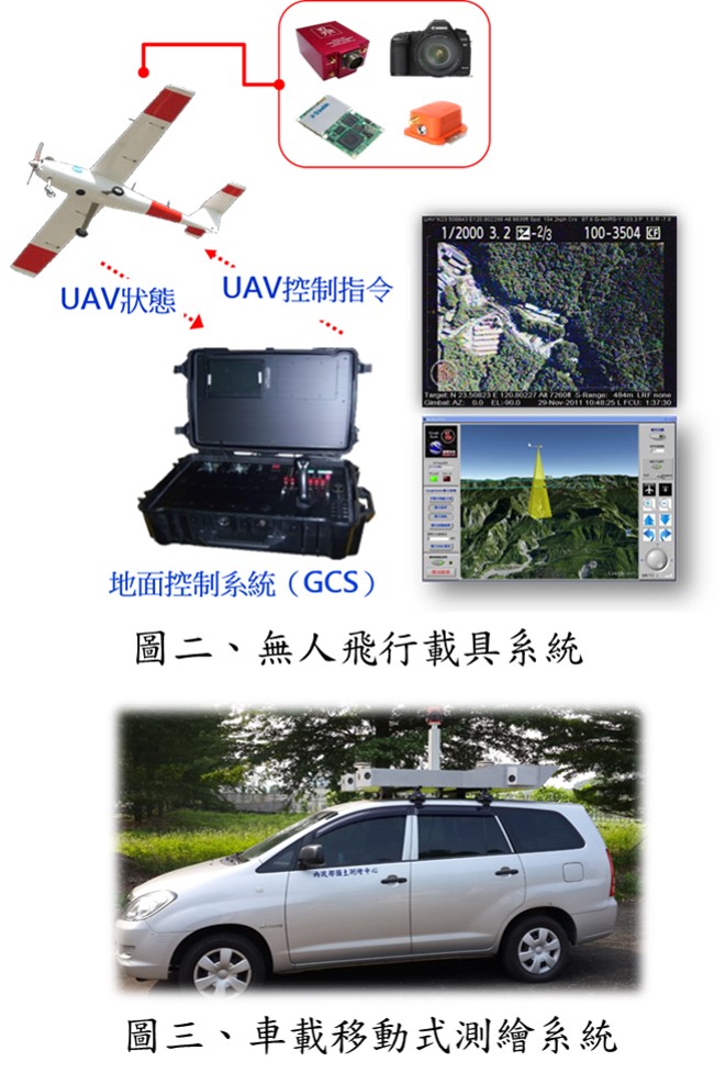 近二十年來,航遙測技術快速精進,具有資料獲取週期短、可迅速掌握地表改變狀況、影像資料涵蓋範圍廣、較不易受通視與地形地物阻擋之限制等優勢,國家測繪製圖多以航遙測技術進行測繪及運用空間資訊技術提供應用。加以無人飛行載具系統(Unmanned Aircraft Systems, UAS, 圖二)、車載移動式測繪系統(Mobile Mapping System, MMS, 圖三)、電子化全球衛星即時動態定位系統(Electronic Global Navigation Satellite System, e-GNSS)、單或多音束測深、航空攝影測量、空載光達測量等技術多元搭配應用,整合既有圖層資訊,可有效運用於測繪圖資更新、協助防救災、環境監測等應用。