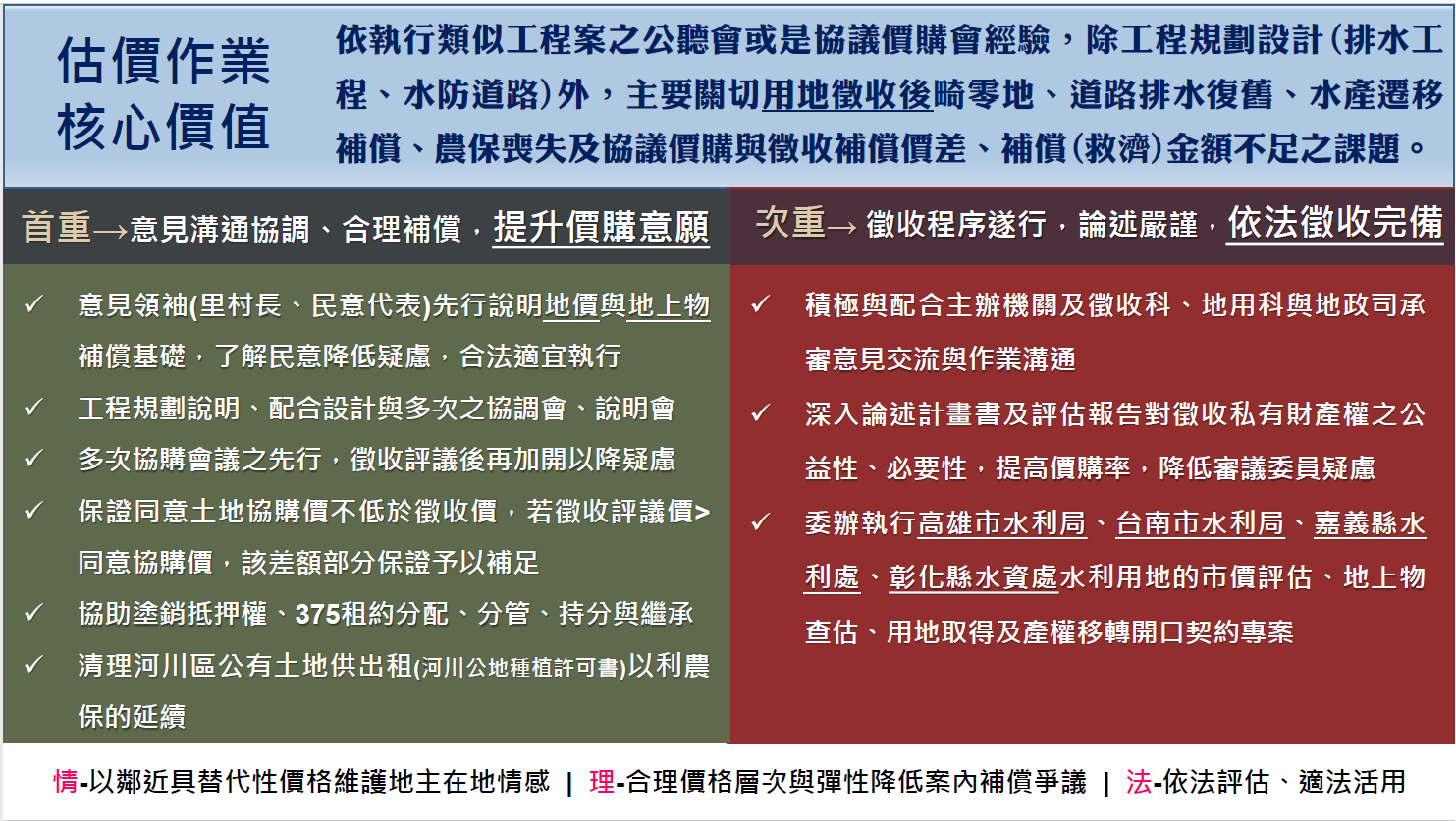 講座依執行類似工程案之公聽會或協議價購會議經驗,除工程規劃設計(排水工程、水防道路)外,主要關切用地徵收後畸零地、道路排水復舊、水產遷移補償、農保喪失及協議價購與徵收補償價差、補償(救濟)金額不足等課題。提出協議價購階段應注重意見溝通協調、合理補償(如保證協議價購價不低於徵收價),提升價購意願,徵收程序階段應重視程序遂行,論述嚴謹(如掌握區域行情、前期附近區域協議價購價格與徵收市價),依法徵收完備等執行建議(圖二)。