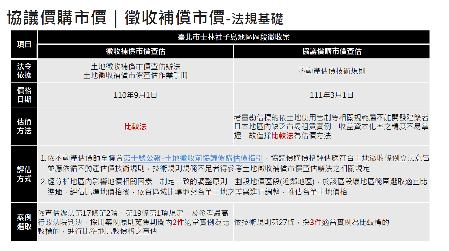 土地徵收條例101年修正,以「市價」作為土地徵收補償的依據(土地徵收條例第30條),並規範需用土地人應踐行「協議價購或以其他方式取得」徵收先行程序(同條例第11條),落實保障人民財產權。又依土地徵收補償市價查估辦法第3條,土地徵收補償市價查估得委託不動產估價師辦理。實務上,需用土地人經常同時委託不產估價師辦理協議價購市價與徵收補償市價查估作業,講座從「法規基礎」與「價值基礎」說明兩者關係(圖一),並指出中華民國不動產估價師公會全國聯合會「第十號公報-土地徵收前協議價購估價指引」,作為不動產估價師依據不動產估價技術規則辦理協議價購評估過程,於技術規則不足部分,得參考土地徵收補償市價查估辦法相關規定之基礎。