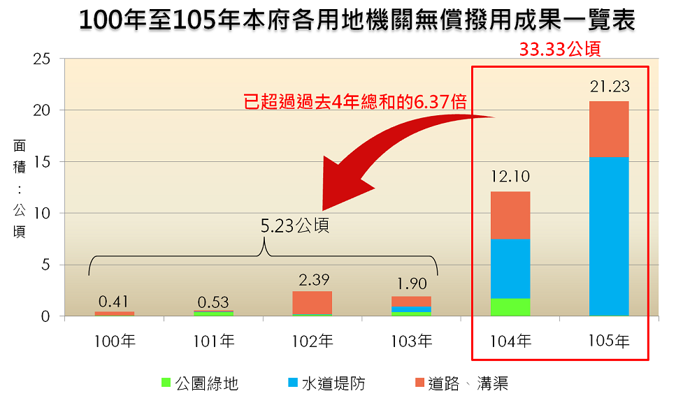 為評估檢討各用地需求與撥用期程,經林欽榮副市長於104年11、12月間多次召開本市公有(非市有)空地清查與活化專案會議,並於105年2月中提報市政會議,督促各用地機關儘速辦理撥用。統計截至105年12月中為止,各用地機關已依評估結果完成無償撥用取得301筆各類土地,面積33.33公頃,以105年公告現值計算,為市府增加約490億元可運用的土地資產,累計本府近2年無償撥用取得面積為過去4年總和的6.37倍,可達成公有土地「管用合一」,並加速推動市政建設。短期利用益全民