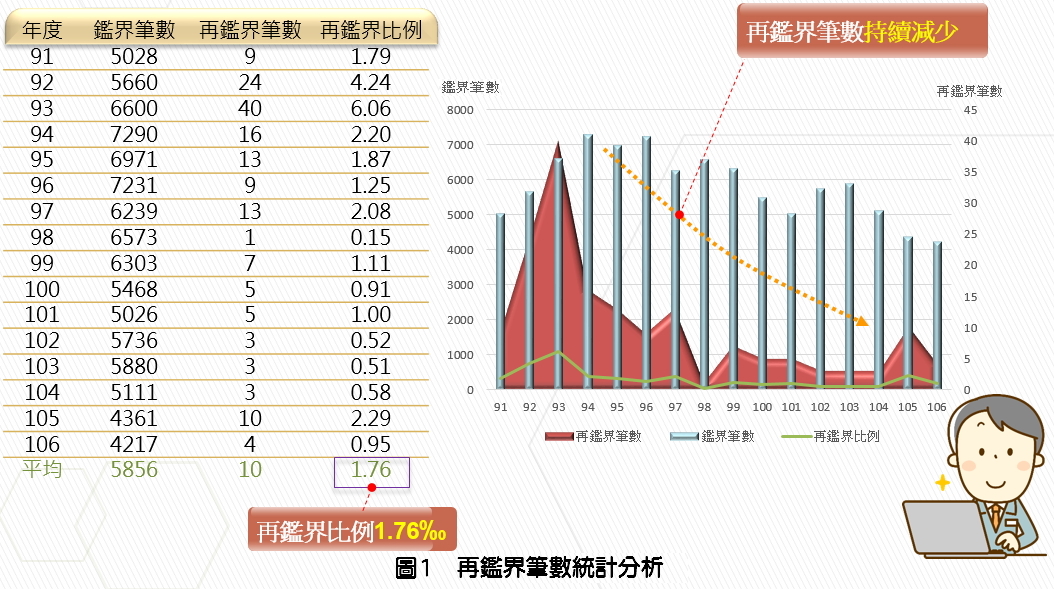 土地鑑界作業影響著土地界址位置正確與否,且錯誤造成的代價將高達千萬甚至數億元之多,本局檢視本市土地鑑界品質的情況,統計91至106年度間本市實際受理鑑界筆數與再鑑界筆數間的關係(圖1),可以看到每年平均受理鑑界筆數計5,856筆,而每年平均再鑑界筆數計10筆,再鑑界比例僅占1.76‰。再進一步統計再鑑界案件中不符比例(圖2),可以發現從91年度截至106年度為止,再鑑界不符的比例從高達77.78%,大幅下降到近6年連續無不符的情況,反映了本市土地鑑界品質在持續提升中。