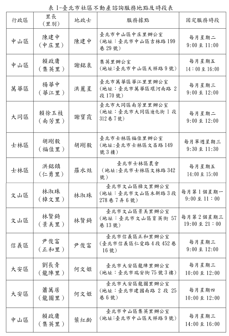 為了進一步切合民眾所需,協助解決問題,本局與本市地政士、里辦公處、本市地政士相關公會及志願服務協會等共同協力,自106年3月1日起推動「社區不動產諮詢服務」試辦計畫,將不動產諮詢服務與鄰里中心結合,提供民眾在地免費地政業務諮詢服務,使地政工作服務觸角延伸至社區,由被動諮詢問答服務轉化為主動積極,將地政工作推向社區。目前有士林區仁勇里、文山區景美里等11個服務據點(見表1),而為使本項服務造福更多市民朋友,本局除繼續調查有意願提供場地之里辦公處,亦歡迎地政士公會及志願服務協會之會員地政士踴躍向所屬公(協)會報名,本局安排媒合後,將增加本諮詢服務之據點,讓社區不動產諮詢就在您身邊。