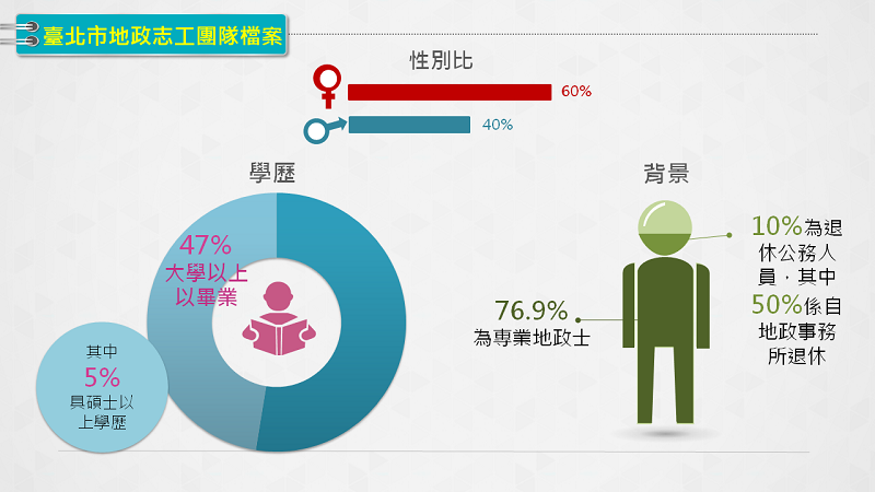 圖1:臺北市地政志工性別比、學歷及背景組成示意