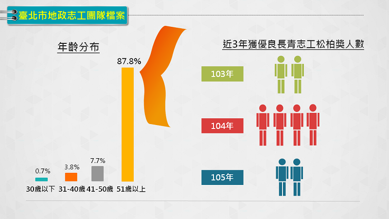 圖2:臺北市地政志工年齡分布及近3年獲獎人數