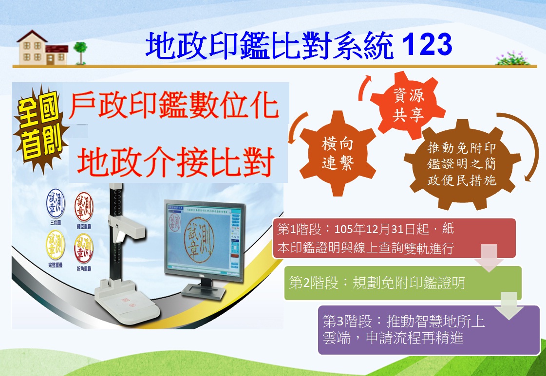臺北市政府地政局與民政局合作,地政局及所屬各地政事務所、土地開發總隊,自105年12月31日起開始試辦介接使用民政局建置的「數位印鑑比對系統」。透過機關間橫向連繫,資源共享,規劃推動免附印鑑證明之簡政便民措施。