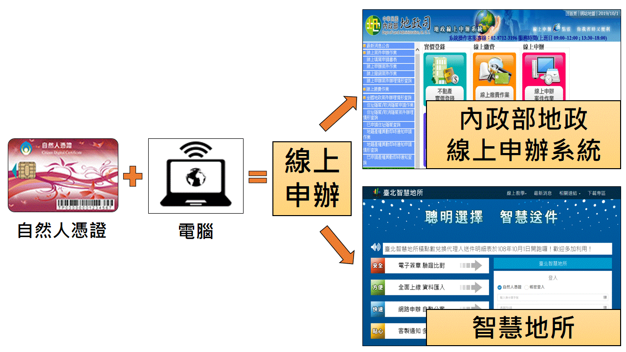 只要您持有自然人憑證,即可透過「內政部地政線上申辦系統」及「臺北智慧地所服務系統」申辦簡易案件,無須再至地政事務所臨櫃辦理。