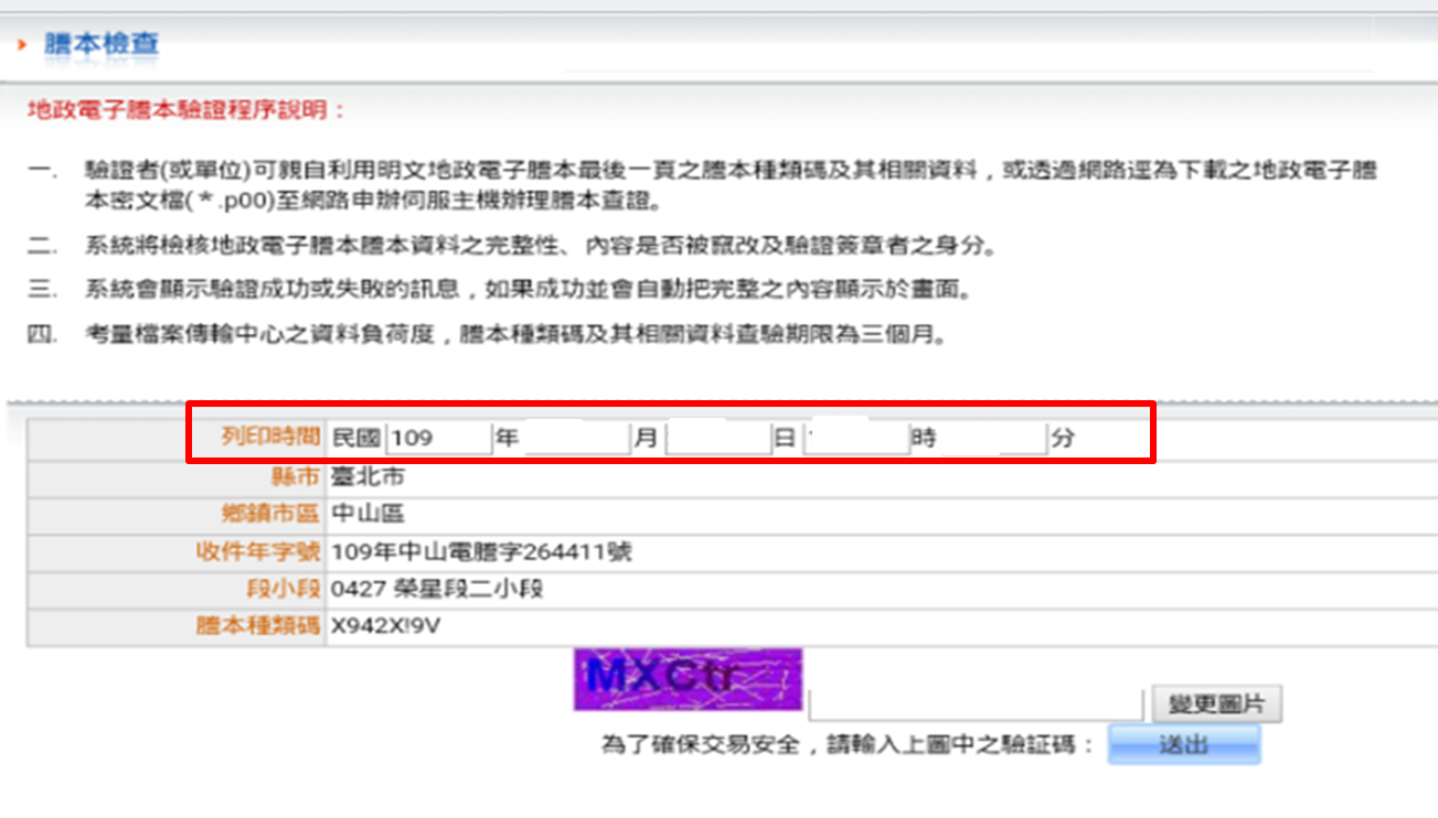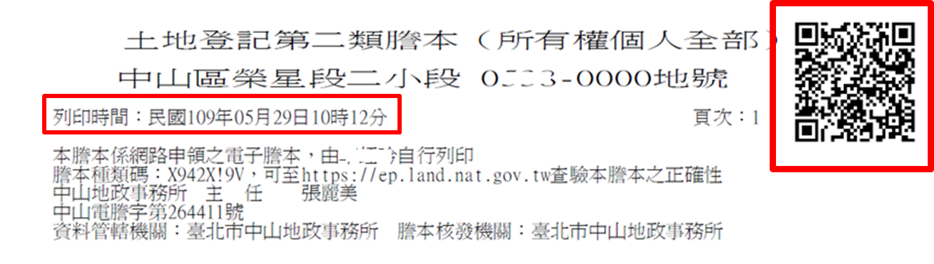 此外,網路電子謄本系統亦提供線上驗證三個月內之地政電子謄本功能,可掃描謄本右上角之QRcode進行線上查驗,系統將檢核地政電子謄本資料之完整性、內容是否被竄改及驗證簽章者之身分。