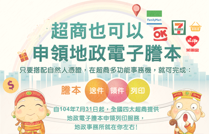 如果您沒有讀卡機也沒有印表機,只要您在上班時間(周一至周五,上午8點至下午5點),帶著自然人憑證到到四大超商(7-11、全家、萊爾富、OK),使用多功能事務機(e政府服務申請/繳費/列印),即可列印所需要的第二類謄本、地籍圖或建物平面圖。