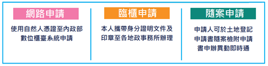 準備好您的自然人憑證,連上內政部地政司「數位櫃臺」網站,動動手指就能完成申請,不受時間地點限制。
