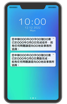 案件審查登記完畢後,還會再發送通知,讓您在第一時間知悉,遇有不法人士偽造文件、冒名申請不動產移轉或借貸,能及早因應處理。