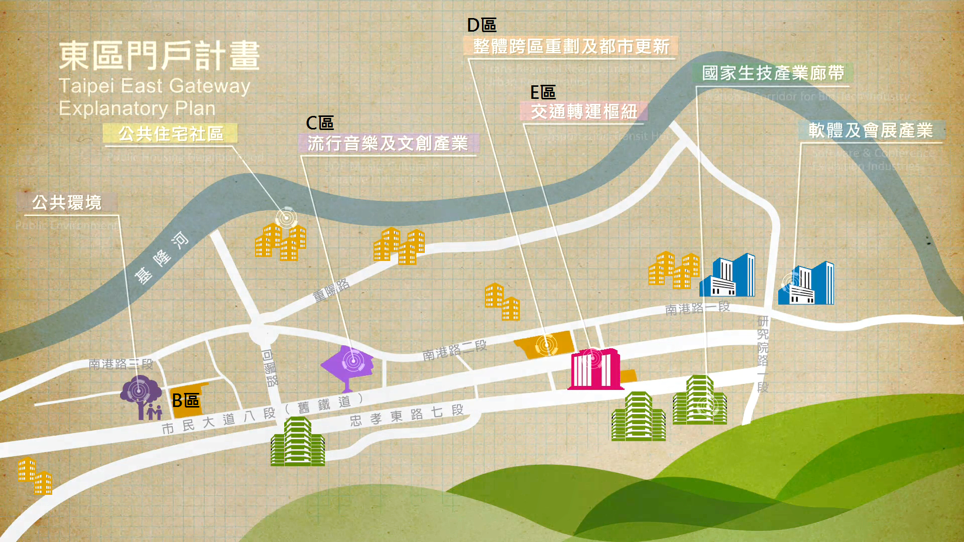四鐵共構的南港車站區位優異,市府因此併同車站周邊地區提出臺北市東區門戶計畫的大戰略,規畫了「國家生技產業廊帶」、「軟體及會展產業」、「交通轉運樞紐」、「公共住宅社區」、「公共環境」、「跨區重劃及都市更新」、「流行音樂及文創產業」等7大構想。