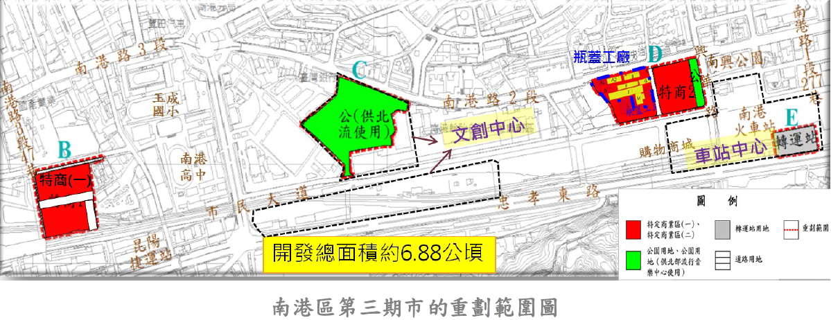 南港早期為大型工廠進駐,有「黑鄉」之稱,後來產業結構變遷、工業出走,雖不再是黑鄉,但仍面臨綠地不足、公共設施缺乏、產業停滯的問題,南港的發展迫切需要新的開始;為此,臺北市政府配合南港車站鐵路地下化及產業轉型,規劃包括會展中心、軟體中心、車站中心、文創中心及生技中心等五大中心,更進階推動東區門戶計畫,而位處樞紐的南港區第三期市地重劃案可說是計畫中重要環節。