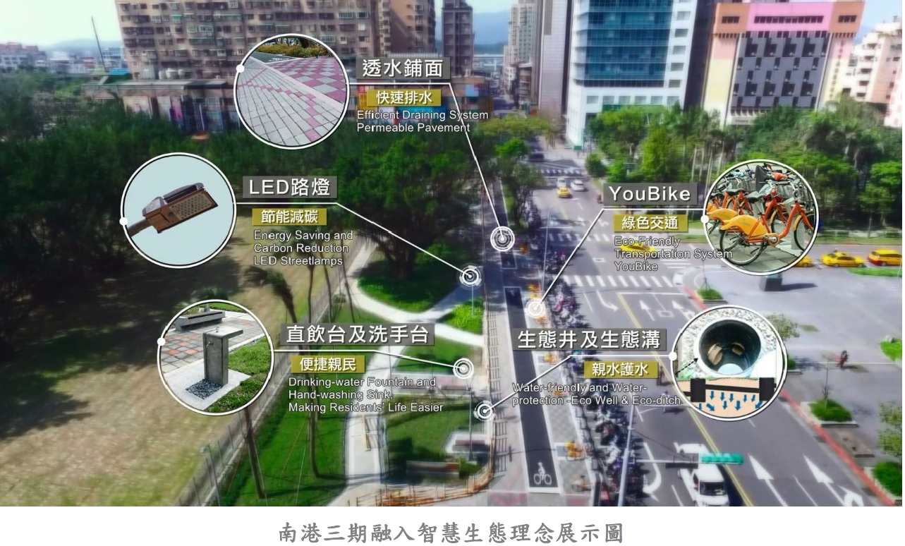 南港三期立基於4.0的重劃概念,除取得文創與交通用地、開闢公共設施外,並以站在巨人肩膀上往前眺望的前瞻思維,擴大保留瓶蓋工廠的歷史建物、縫合開發區內外的公共設施,讓道路、維生管線銜接順暢;納入環保永續智慧生態的思維,在新闢公園中設置直飲台、節能減碳的LED燈、透水性鋪面人行步道、保水量17.3噸的滲透性側溝、綠色交通Youbike站等設施,南港三期不僅只有經濟面向,更能讓歷史與未來、故舊與創新和諧並存,同時也做為臺北市智慧生態示範區,為南港居民打造更美好的家園,朝宜居城市的目標大步邁進。