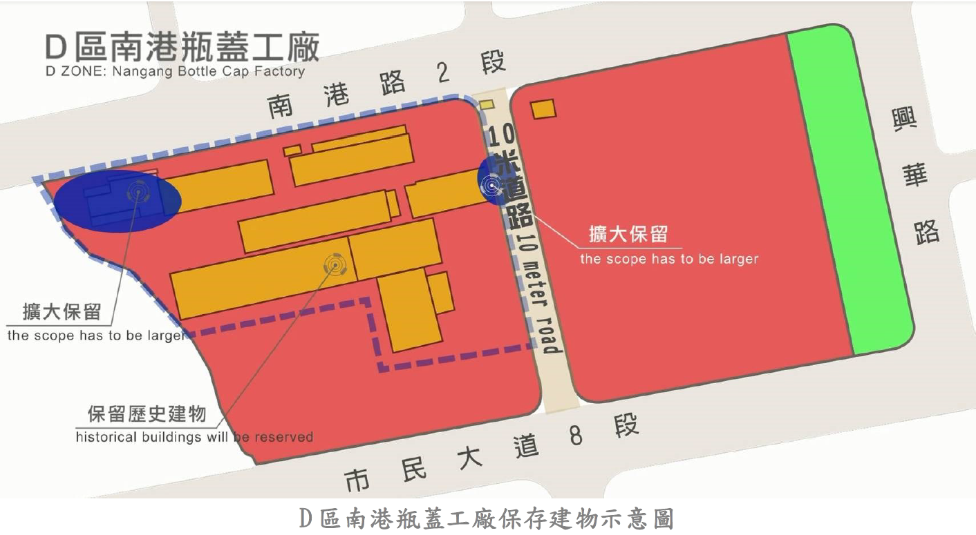 南港三期為臺北市第一個跨區重劃的案例,是南港區域再生指標性的重劃案,土地所有權人、當地居民、企業、民間團體等社會各界莫不投以關注的眼光,只是關注越多,未來想像越是紛歧,除了要與眾多地主協調用地分配外,更要滿足當地居民期待、公民團體的要求,重劃過程中,甚至對於文資保存發生激烈抗議。臺北市政府面對各界不同聲音,以公開透明方式擴大公民溝通與參與,就重劃區內南港瓶蓋工廠保留爭議,特別成立專案小組,邀請各相關權利人士多方溝通協調,全程錄音錄影並將所有資料上網;透過公私協力的相互討論,除依文資審議結果保留歷建,更擴大保存部分非歷建之屋舍,也更為此首創立面挪移工法,以維持瓶蓋工廠建築群的風貌及保存歷史紋理。