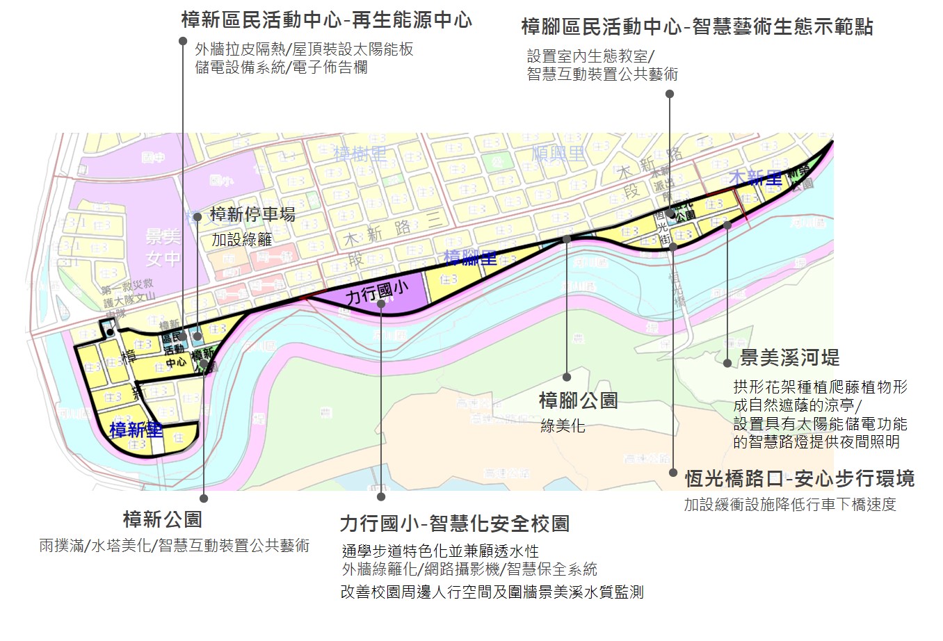 - 安心、健康、趣味的步行環境-恆光橋路口劃設減速標線緩衝車輛速度;另於河堤步道拱形花架種植爬藤植物形成自然遮蔭的涼亭、設置具有太陽能儲電功能的智慧路燈提供夜間照明,使樟新及樟腳里間的步行環境得以連續,增加居民步行意願。